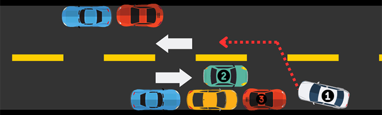 - The driver of car #1 can't see when car #2 is approaching due to car #3. Car #1 must then travel in the wrong direction to exit the space, which may lead to a collision with car #2.